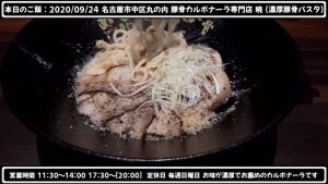 本日のご飯-007:愛知県名古屋市中区丸の内 豚骨カルボナーラ専門店 暁 (濃厚豚骨パスタ) 2020年12月30日 【YouTubeに動画アップ】 【ヒマラジオン】 本日のご飯 愛知県名古屋市中区丸の内 豚骨カルボナーラ専門店 暁 (濃厚豚骨パスタ) 2020年09月24日 愛知県名古屋市中区丸の内2-14-21 052-204-9102 定休日:日曜日 11:30~14:00 17:30~[20:00] 営業時間は短いですが 濃厚なパスタ/カルボナーラ が美味です 最後のご飯も美味しくいただけます 駐車場等はありません ▲>>>動画はコチラです<<<▼ でわでわ